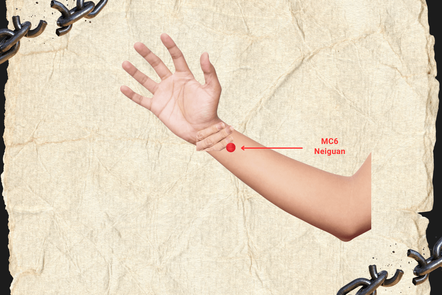 À trois largeurs de doigt sous le pli du poignet, sur la face interne de l’avant-bras, entre les deux tendons centraux.
